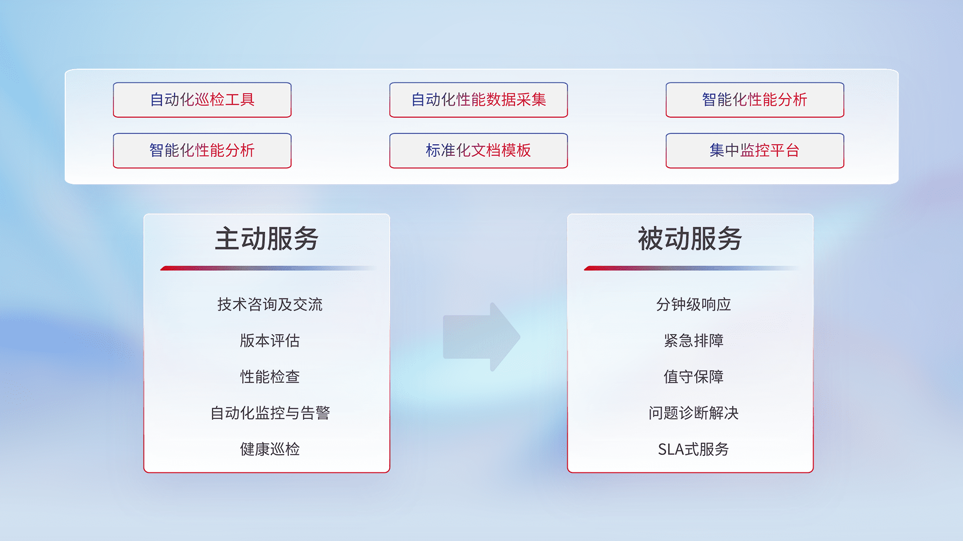 智能化工具和标准化文档,,,保障服务质量,,,,提供主动服务(包含技术咨询、、版本评估、、、性能检查、、、自动化监控与告警、、、、健康巡检)和被动服务包含(分钟级响应、、紧急排障、、值守保障、、问题诊断解决、、、SLA服务)。。。。