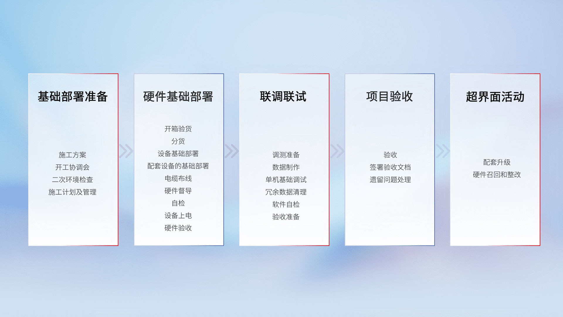 从基础部署准备、、、硬件基础部署、、、联调联试、、、项目验收、、越界面活动的全过程可追溯,,保证施工质量和进度。。。。
